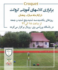 ویژه در جعبه ها, دستهبندی نشده, کروکت, مقاله ها برگزاری کلاسهای آموزشی کروکت در ایام ماه مبارک رمضان روزهای یکشنبه،سه شنبه،پنج شنبه و جمعه از ساعت ۱۸ الی ۲۲ در باشگاه ورزشی وی-رویال برگزار می گردد برچسبها: GOLF CROQUET Player Stadium آموزش،croquet، Player Sports کروکت پست قبلی آغاز ثبت نام دوره های آموزشی کروکت جعبه ها دستهبندی نشده کروکت فروردین ۲۹, ۱۴۰۵ پست بعدی تمرینات دوره های آموزشی کروکت در باشگاه وی – رویال جعبه ها دستهبندی نشده کروکت مقاله ها فروردین ۲۹, ۱۴۰۵ Attachment